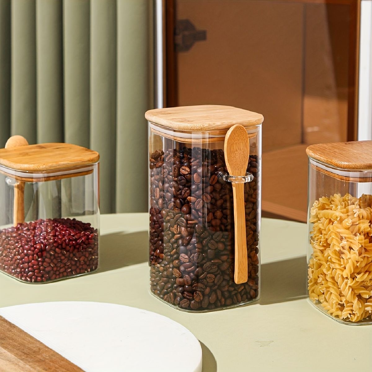 Set de 3 frascos de vidrio con tapa, cuchara y soporte de bambú. Ideal para organizar frutos secos, especias, semillas.