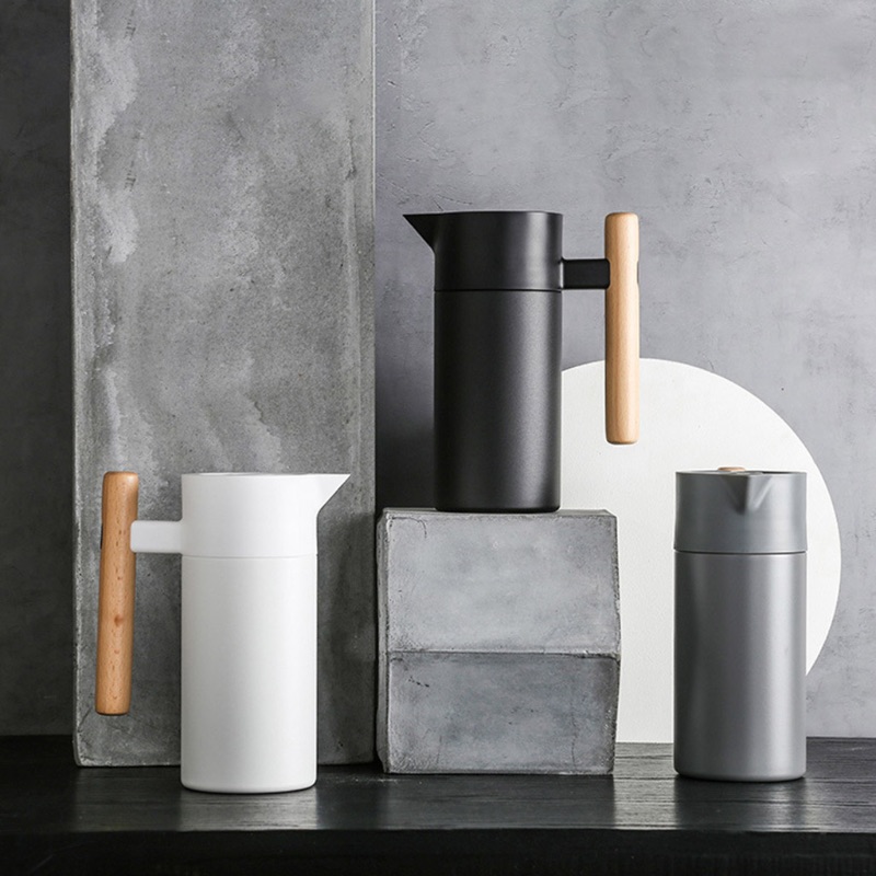 Jarra térmica de acero inoxidable, con cierre hermético. Hermoso diseño, disponible en color blanco y negro con asa de madera de acacia. Dispone de un botón para activar la salida de la bebida.